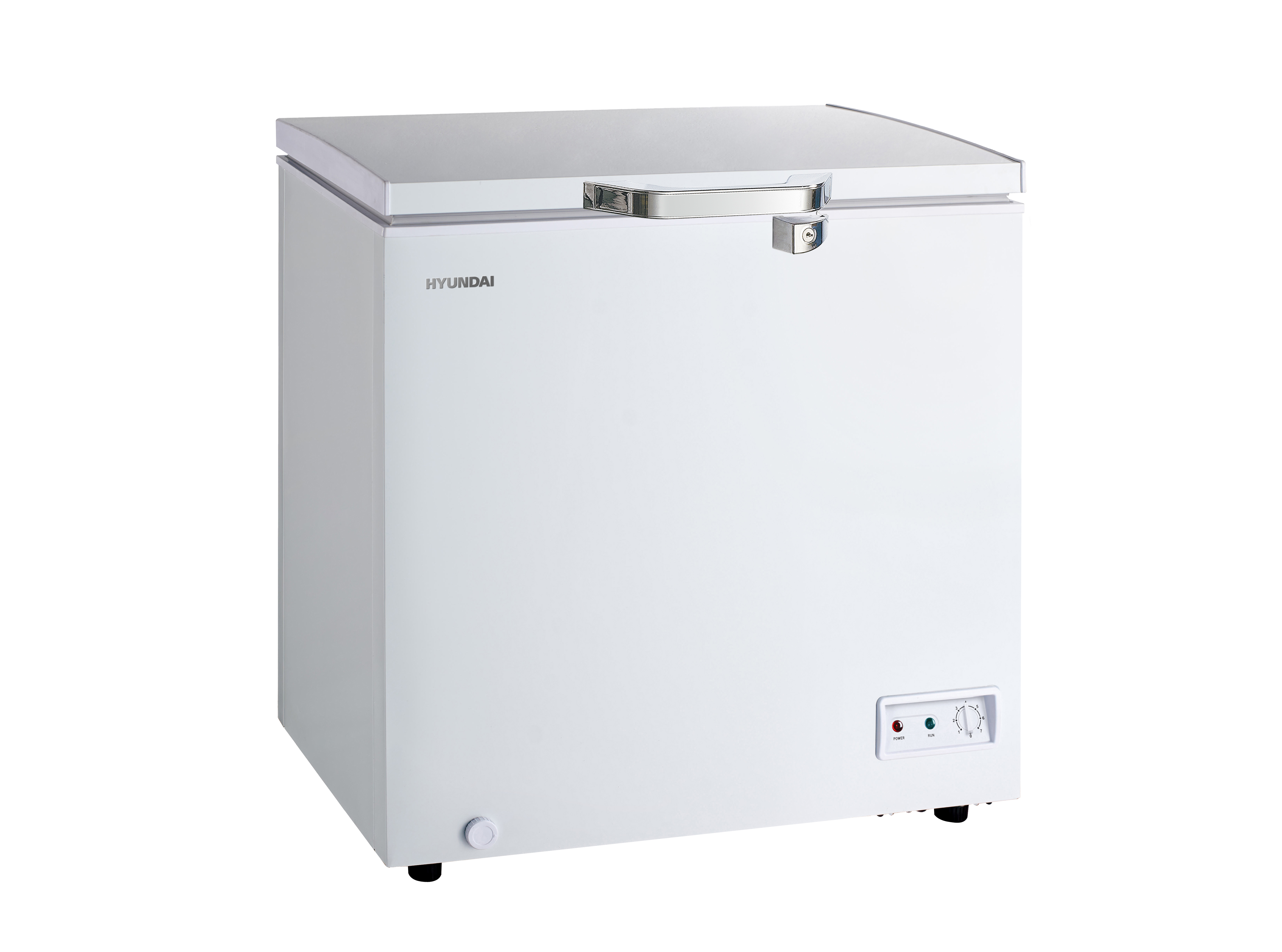 The Hyundai HYCF-XT195WH snow-white chest freezer with a useful volume of 140 liters is equipped with mechanical control. The total volume is 195 liters. Defrosting is done manually as the need arises. This model has an accelerated freezing mode. After an emergency de-energization, the products are stored in proper condition. The chamber is cooled by a single compressor and refrigerant. The noise level does not cause discomfort to the user. The door, which is the lid of the freezer, opens up.