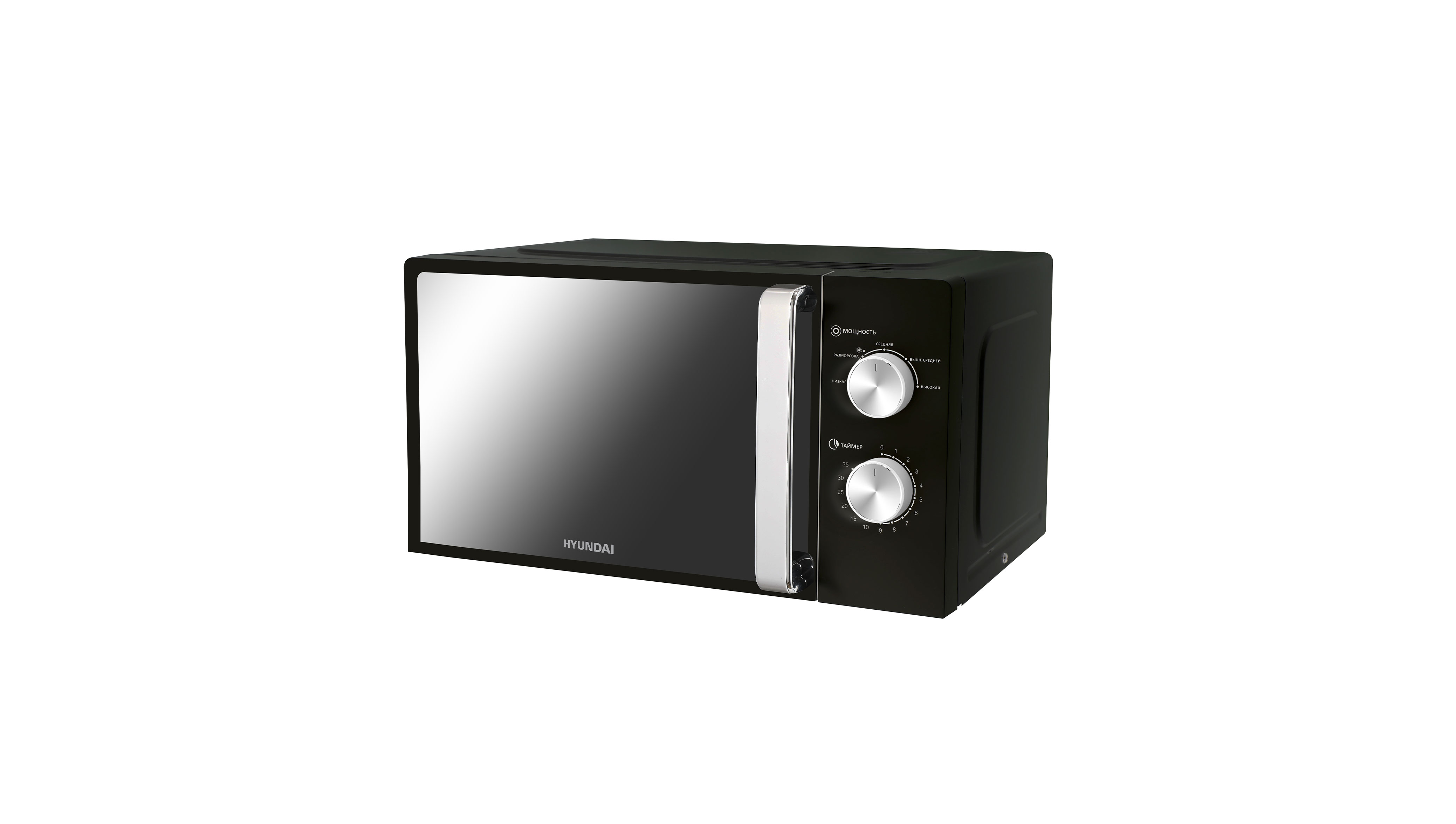 The HYUNDAI HYMW-M25E1GB is a 25L freestanding microwave oven with a stylish black body and elegant silver handle/knob details, paired with a mirror door glass for a premium, retro-inspired look.